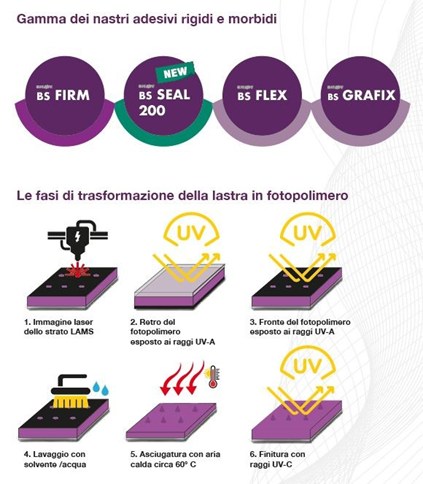 Versatile: Si adatta facilmente al processo scelto dal cliente. E’ utilizzabile anche per l’applicazione prima del ciclo di lavaggio con solventi e asciugatura della lastra, grazie alla sua composizione di adesivo e supporto in PET.